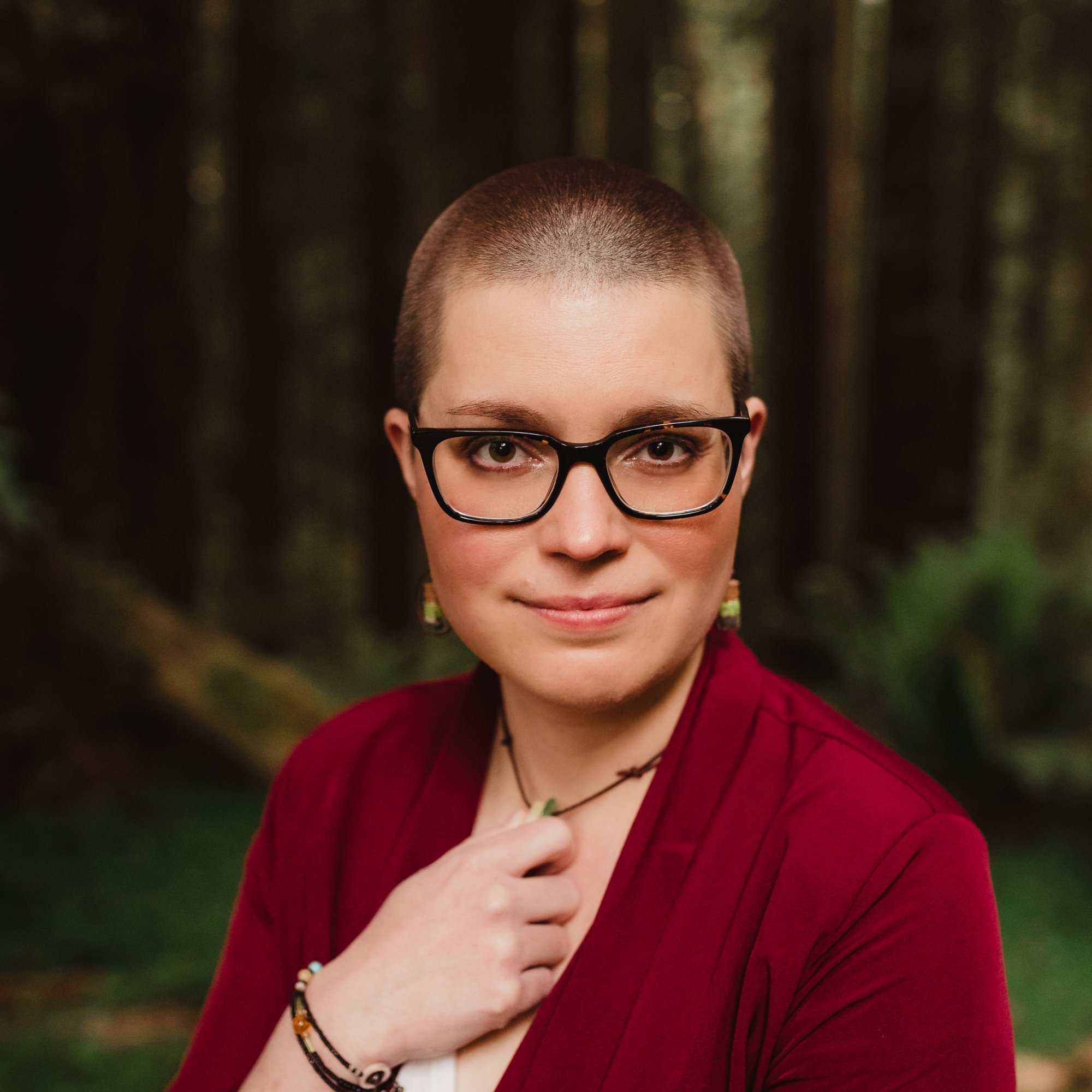 White women in her 20s with long dark blonde/light brown hair and glasses wearing a black polo shirt and looking at the camera