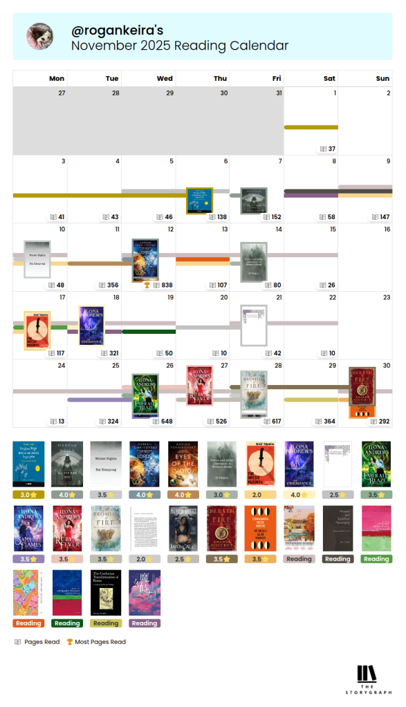 November is over and it’s already the final month of 2025! Crazy stuff – although this also means my favourite time of year will soon be upon us… November was extremely successful in some ways (I read a lot of books) and not so successful in other ways (a large number of those books were not the books I had intended to read). Without further ado, let’s take a look!