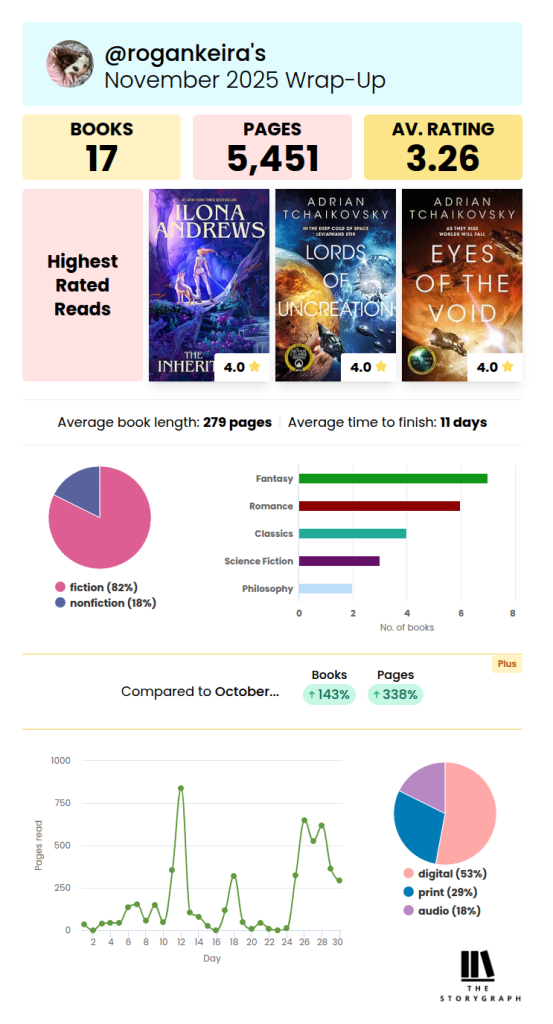 The four Ilona Andrews books I also finished this month – and all but The Inheritance were ebooks. That leaves us with A City on Mars and Wanderers, as well as my priority release for 2025 Q4 – The Everlasting. I hope to get to The Everlasting at least some point in December.