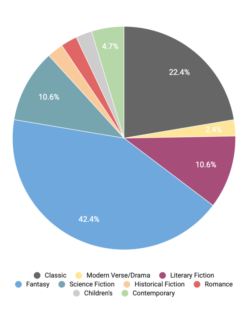 This is probably because I reread a decent amount of what might be considered ‘fantasy romance’ books. I list them under fantasy because I think they’re more fantasy heavy than romance heavy – more strictly ‘romantasy’ books get put under ‘romance’ – but Storygraph will count those books for both ‘fantasy’ and ‘romance’. I have a subgenre graph as well which shows about 5 romantasy and 14 fantasy romance books, but that graph is too ugly to show you (so many tiny slivers!).