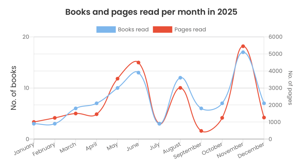 And if we exclude the 25(!) books that I reread this year, then I still read 65, which is well above my target for 2025.