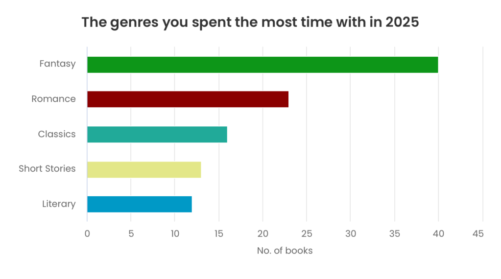 According to the Storygraph, my most read genre was fantasy, and my own records would agree with that – about 42.4% of the fiction I read this year was fantasy, and that’s similar to the overall percentage as well. However, whilst my own records put romance at about 2.4%, Storygraph lists this as my second-most read genre.