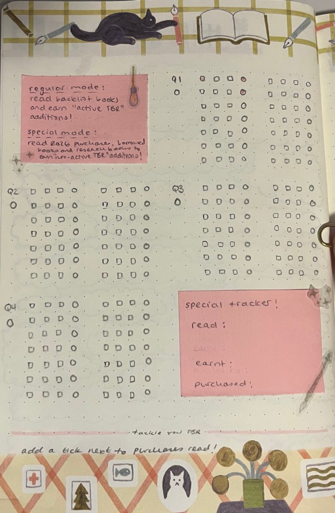 Normal – for every 3 books I read that were on my active TBR before 1/1/2026, I can purchase 1 book for my active TBR. My active TBR are books that I could pick up and finish at any point.