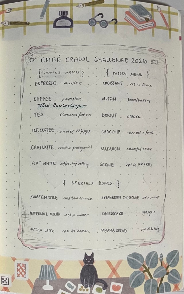 This is a café-themed reading challenge with 12 main prompts and 6 bonus prompts based on drinks and food you’d order in a café. I’m going to try and fill as many as possible.
