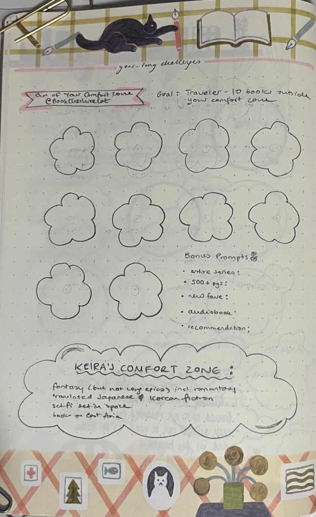 For the sakes of this challenge, I tried to define what my comfort zone is: fantasy (except long epics), translated Japanese/Korean fiction, sci-fi set in space, and books on premodern East Asia are all not allowed to be used in this challenge (for me). For other books, I’ll use my gut feeling to determine if it counts!