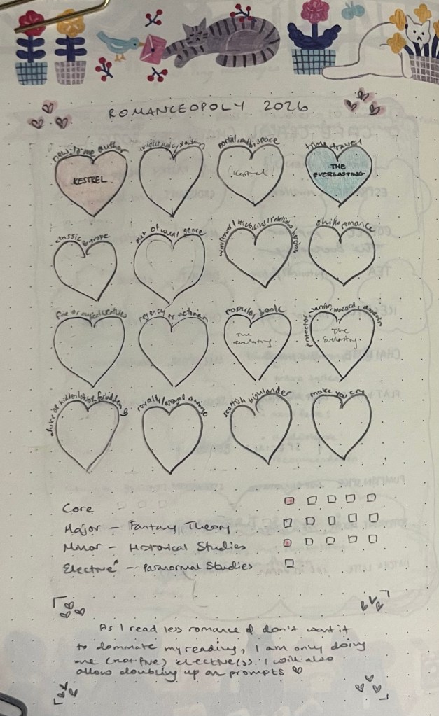 Romanceopoloy is by far the most complicated of these year-long challenges – the thing that comes closest to it in terms of vibe/set up is probably the Magical Readathon (which I will be trying to actually complete in 2026…) but this one is specifically focused on romance books. It has nothing to do with any of my goals, I just think it’s a fun concept so wanted to join in.