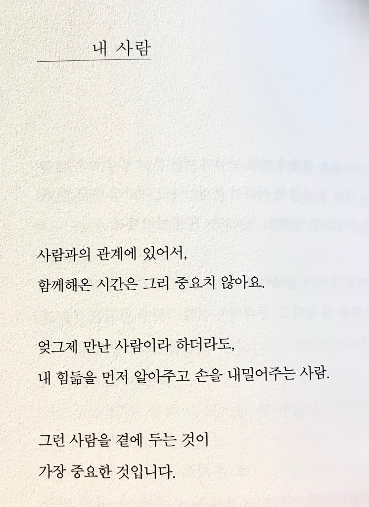 In Korean, they call them essays, but a lot of them are closer to what we might think of poetry in terms of form – although the language is more like an essay rather than a poem in that they’re comprised of quite straightforward, full sentences just broken up over multiple lines. Please see an example from the Korean of one of the more poem-like essays below for your reference! (Translation is my own (and very rough!) as I don’t own a copy of the English translation.)