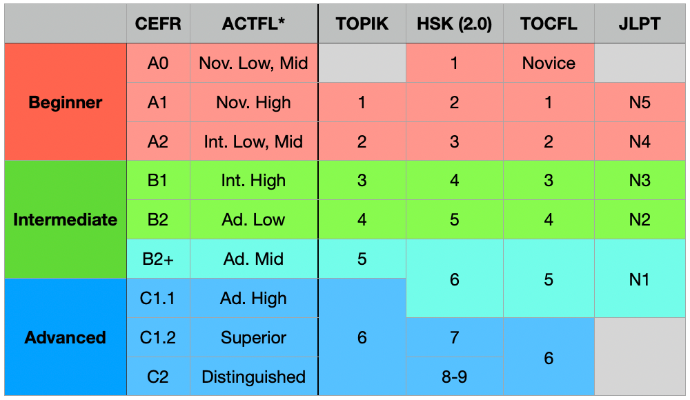 Here I will briefly show what I consider the equivalent of CEFR to be in the ACTFL levels (used in the US), as well as in the language level systems used in China, Taiwan, Korea and Japan (as the languages I am learning) – no need to do it for any of my other languages as they use the CEFR system directly.