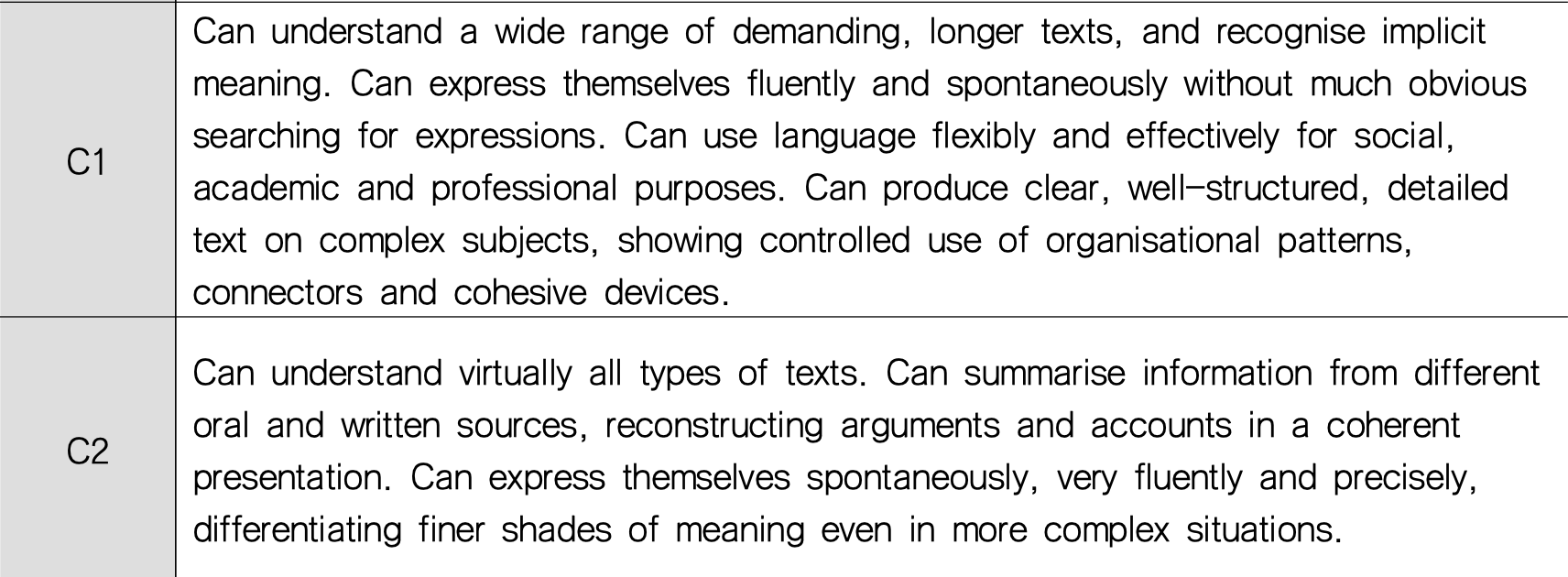 - Kim Chungsook, Lee Junho, and Lee Jung Hee. “한국어능력시험(TOPIK)과 유럽공통참조기준(CEFR)의 등급 기술 비교·연계 연구 [A Study on an Analysis and Comparison of the Level Descriptors of the Test of Proficiency in Korean (TOPIK) and the Common European Framework of Reference for Languages (CEFR)]”, Korean Education 36, no. 1 (2025): 109-138. DOI : 10.18209/iakle.2025.36.1.109.